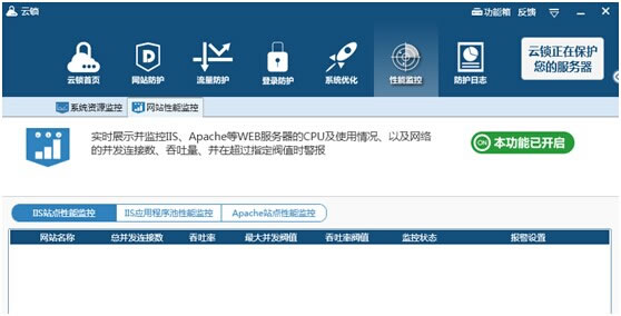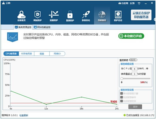 云鎖界面功能導航也沒啥特別的,界面大同小異,在平日涉及的網站、服務器安全需求也都囊括進去了,操作也符合傳統軟件的使用風格,簡易便捷。首頁呈現了服務器的各項狀態,服務器信息一目了然。 2、網站、服務器各資源監控、可設定異常預警線。 云鎖能夠實現對網站性能數據的可控可觀,可對這些數據(并發連接數、吞吐量等)根據實際工作情況在云鎖里設定一個“危險警戒線”,當出現異常情況時會及時報警通知。 ![]()