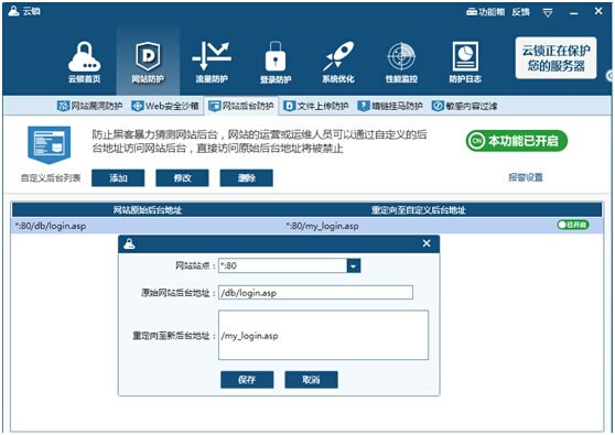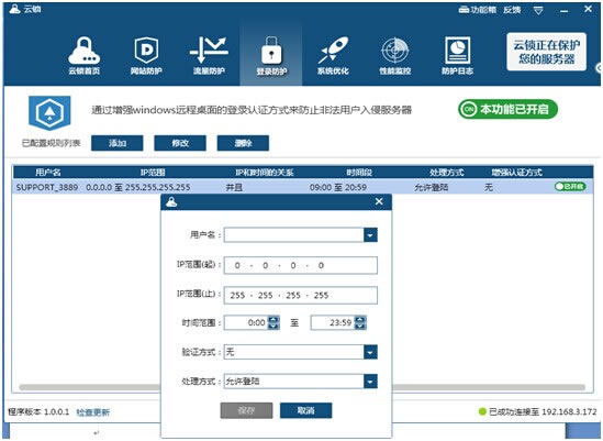 服務器性能監控,系統資源(cpu使用率、內存使用率、磁盤、網絡 IO)監控圖形化界面展現,在圖形中可設定“危險警戒線”,當出現異常情況時,圖形界面一目了然。 ![]() 3、用戶管理賬號防護 云鎖可雙向保障賬號安全,一個是可以自定義后臺地址,相當于隱藏了網站后臺地址,防暴力猜測網站后臺;另一個是服務器賬號登錄防護,選擇服務器管理員賬號,可以限制登錄時間段、 IP及IP段,保障非工作時間賬號安全,防黑客入侵服務器。