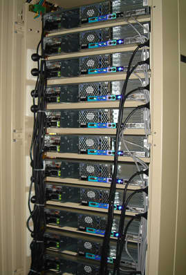 機架式服務器是一種外觀按照統(tǒng)一標準設計的服務器,配合機柜統(tǒng)一使用。可以說機架式是一種優(yōu)化結構的塔式服務器,它的設計宗旨主要是為了盡可能減少服務器空間的占用,而減少空間的直接好處就是在機房選擇機架式服務器托管的時候價格會便宜很多。 機架服務器的寬度為19英寸,高度以U為單位(1U=1.75英寸=44.45毫米),通常有1U,2U,3U,4U,5U,7U幾種標準的服務器。機柜的尺寸也是采用通用的工業(yè)標準,通常從22U到42U不等;機柜內按U的高度有可拆卸的滑動拖架,用戶可以根據(jù)自己服務器的標高靈活調節(jié)高度,以存放服務器、集線器、磁盤陣列柜等網(wǎng)絡設備。服務器擺放好后,它的所有I/O線全部從機柜的后方引出(機架服務器的所有接口也在后方),統(tǒng)一安置在機柜的線槽中,一般貼有標號,便于管理。 看看下面的兩張圖片你就明白了為什么要推出機架式服務器了: