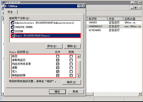 4、選擇用戶組名稱“Ueser”這條,將“Ueser的權限”勾選“修改、讀取和運行、列出文件夾目錄、讀取、寫入”這幾項勾選好,然后進行保存。