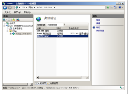 第二步,在站點(diǎn)主頁(yè)窗口中,選擇“身份驗(yàn)證”,雙擊,顯示“身份驗(yàn)證”窗口。默認(rèn)情況下,“匿名身份驗(yàn)證”為“啟用”狀態(tài),如下圖所示: