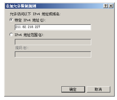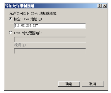 第二步,在右側(cè)“操作”任務(wù)欄中,單擊“添加允許條目”鏈接,顯示如下圖所示的“添加允許限制規(guī)則”窗口。如果要添加一個(gè) IP 地址,可點(diǎn)選“特定 IPv4 地址”單選按鈕,并輸入允許訪問(wèn)的 IP 地址即可;如果要添加一個(gè) IP 地址段,可點(diǎn)選“IPv4 地址范圍”單選按鈕,并輸入 IP 地址及子網(wǎng)掩碼即可。