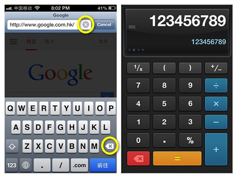 我們再來看看 iOS 中的“刪除”設計,下圖以 Safari 瀏覽器地址輸入時界面為例(其他搜索界面類似),兩個按鈕分別標出(下圖左):