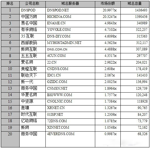 從以上圖表統計數據顯示,上周占據中國域名機構排行榜前20名的分別是:DNSPOD、中國萬網、易名中國、有孚網絡、35互聯、西部數碼、新網互聯、五五互聯、愛名網、美橙互聯、聯動天下、新一代、商務中國、華夏名網、中資源、息壤、時代互聯、億動網絡、新網、商務中國。