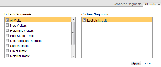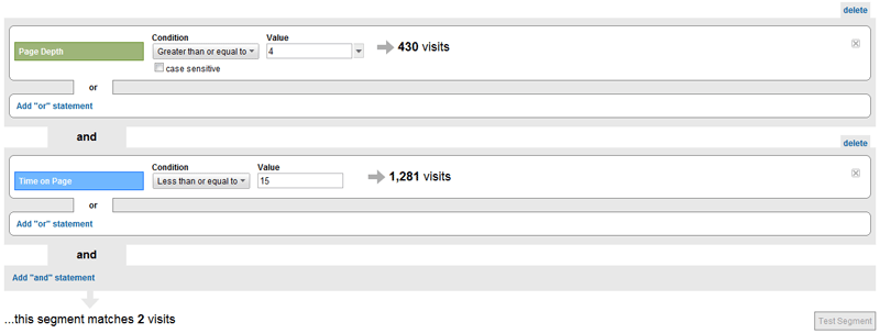 我們可以用戶細分的方法把那些瀏覽頁面數(shù)較多,但頁面平均停留時間較短的用戶瀏覽看作是迷失用戶,具體的數(shù)值可以根據(jù)網(wǎng)站自身的特點進行定義,比如我定義我的博客中瀏覽頁面數(shù)大于等于4,而頁面平均停留時間小于等于15秒的Visits為迷失用戶的瀏覽行為,我們可以借助Google Analytics中的高級群組(Advanced Segment)來區(qū)分出這類用戶,關(guān)于如何使用Google Analytics的高級群組功能,可以參考藍鯨的文章——Google Analytics功能篇—高級群組,如下圖:
