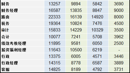 在職能類(lèi)職位中,會(huì)計(jì)的薪水較低,5年以上工作經(jīng)驗(yàn)月薪只有1萬(wàn)左右。薪水最高的當(dāng)然是稅負(fù)、IT支持及法務(wù)。