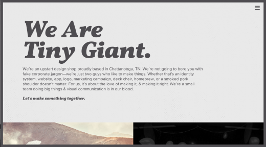 2014年,字體在許多網站設計中發揮重要作用,我未發現這種趨勢在短期內改變的跡象。可是2015年,我看到網站中的標題和字體變得越來越大。夸張地說,就連天上的飛機可能都能看到地面上的字。當你訪問Tiny Giant的網站時,你會看到很大的字體。這實際上是一種聲明,讓你很難錯過。大字體將繼續在2015年的網站設計中發揮重要作用,成為確保提高訪客視覺層次的方法。訪客首先會看到最大的字體,因為那會首先吸引你的注意力。