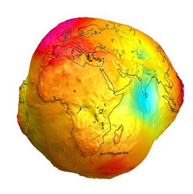 真相:這張圖來源于歐洲空間局,實際上表示的是全球重力的空間差異,而且是夸張了的,目的是讓研究結果更直觀。在你的想象中,仍然可以認為地球是兩極略扁、赤道微突的橢球體。