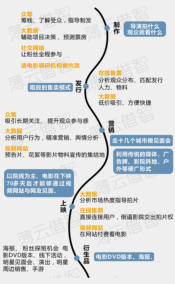 縱觀當下的電影產業鏈,當中有三個關鍵點:渠道、制片方和影院。渠道需要優質的內容,制片方需要更好的營銷和影片曝光,影院需要更多的觀眾。用互聯網思維做電影,利用互聯網產品和模式,來運作包含制作、發行、放映以及相關衍生物在內的整套流程已是行業未來的發展方向。
