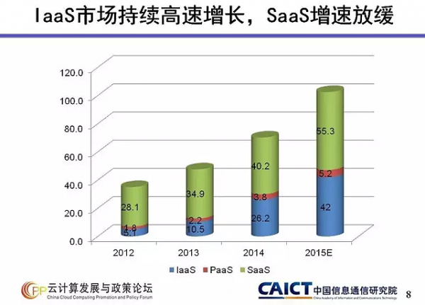 云計算發展調查報告》。報告指出,2015年我國公共云服務總收入預計將達到102.5億元,同比增長46%;IaaS市場總收入預計將達42億元,同比增長逾60%,增勢迅猛。