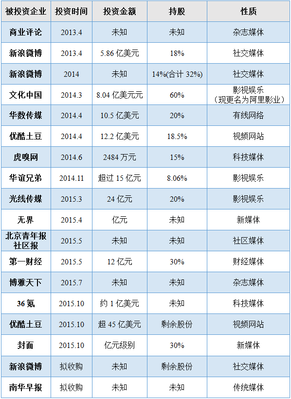 阿里巴巴以電子商務(wù)起家,已經(jīng)吸引了數(shù)以?xún)|計(jì)的龐大用戶(hù)群,之后進(jìn)入互聯(lián)網(wǎng)金融、泛娛樂(lè)產(chǎn)業(yè)、健康產(chǎn)業(yè)、傳媒產(chǎn)業(yè)等,打造了一個(gè)正反饋的正強(qiáng)化生態(tài)系統(tǒng)。阿里巴巴通過(guò)在傳媒業(yè)的一系列的并購(gòu),已經(jīng)成功在視頻、社交媒體、傳統(tǒng)媒體、電影業(yè)、新聞客戶(hù)端等傳媒業(yè)領(lǐng)域布局,傳媒帝國(guó)已然成型,具體見(jiàn)下表。