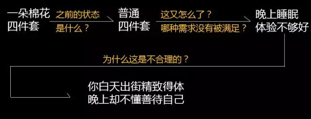 用戶用普通幾十塊的四件套為什么是不合理的?我們發現與白天的行為不一致——白天出街,舍得買大幾千的衣服,而四件套每天都要睡,為什么就不能一樣買點好的?