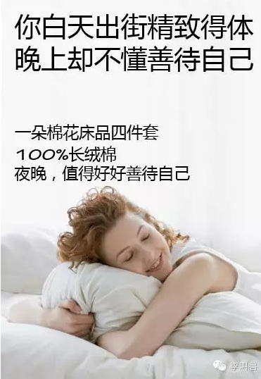 比如“一朵棉花”床品四件套(價格600左右),與大多數人習慣不一致(他們買的很便宜),所以直接說產品可能讓人難以接受。