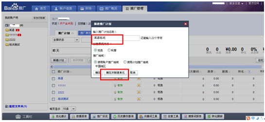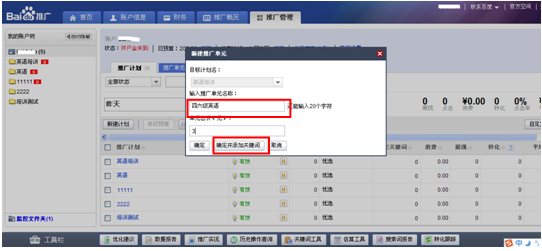 新建好計(jì)劃后,輸入推廣單元的名稱(chēng),并為剛剛提交的單元設(shè)定一個(gè)出價(jià)。設(shè)置好“單元出價(jià)”后,點(diǎn)擊“確定并添加關(guān)鍵詞”,即可進(jìn)入提交關(guān)鍵詞頁(yè)面。(單元的出價(jià)是對(duì)單元中所有關(guān)鍵詞的出價(jià)。例如,您新建了“四六級(jí)英語(yǔ)”單元,為這個(gè)單元設(shè)置的出價(jià)為“3”元,那么“四六級(jí)英語(yǔ)”整個(gè)單元里所有關(guān)鍵詞的出價(jià)都是“3”元。以后如果需要修改出價(jià),可以在推廣單元里修改,也可以直接的關(guān)鍵詞中修改)。