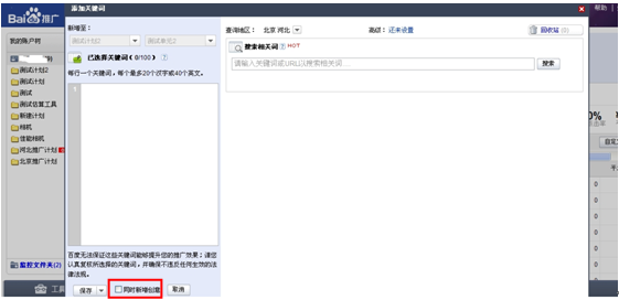 您可以自己直接輸入關(guān)鍵詞,也可以采用系統(tǒng)自動(dòng)推薦的優(yōu)質(zhì)關(guān)鍵詞。保存之前,可選擇匹配模式,若勾選“同時(shí)新增創(chuàng)意”,可直接撰寫(xiě)創(chuàng)意。
