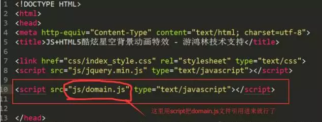 4.然后向空間根目錄的首頁的<head> </head>直接用script引入domain.js代碼:(這里我是直接放在空間里的js文件夾里)