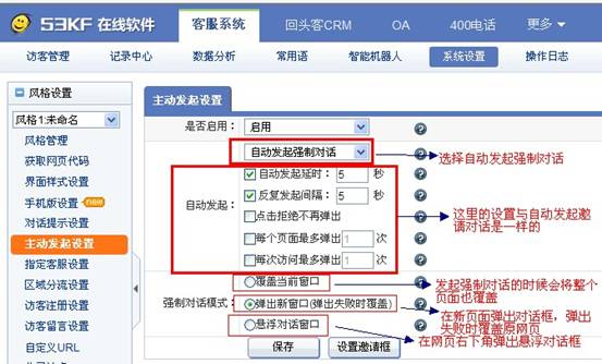 53kf強制對話是一個了不起的功能。當訪客打開網站,系統直接彈出對話框和客戶建立對話鏈接,基本上有意向的客戶,都會選擇直接使用對話框咨詢,效果非常好,很多婚紗攝影用戶都在開啟使用。在選擇自動發強制對話后,選項設置和自動發起設置是一樣,只是增加了選擇強制對話兩種模式,是新窗口打開,還是懸浮對話窗口。