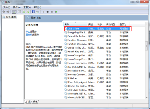 6、在打開(kāi)的“服務(wù)”窗口中,找到“DNS Client”服務(wù),若此服務(wù)沒(méi)有開(kāi)啟,我們“啟動(dòng)”此服務(wù)即可,同樣建議大家啟動(dòng)“DHCP Client”服務(wù)。