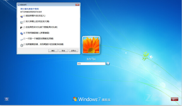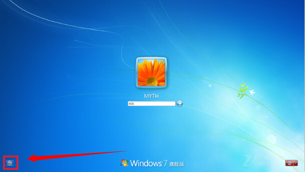 其次,關機進入Win7系統,在輸入密碼的界面,點擊左下角的工具按鈕。