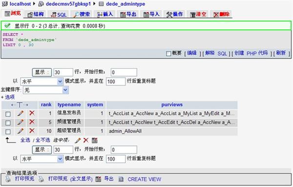 2、其中rank字段是管理權(quán)限,在phpmyadmin查看dede_admintype字段的時候采用”瀏覽模式“可以看到下面的截圖: