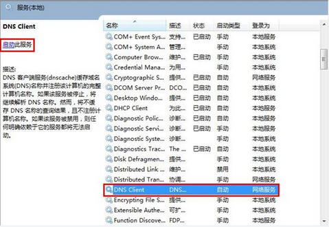 6、需要找到“DNS Client”項(xiàng),并直接點(diǎn)擊左上角的“啟動(dòng)此服務(wù)”,重啟電腦就行了。如下圖:
