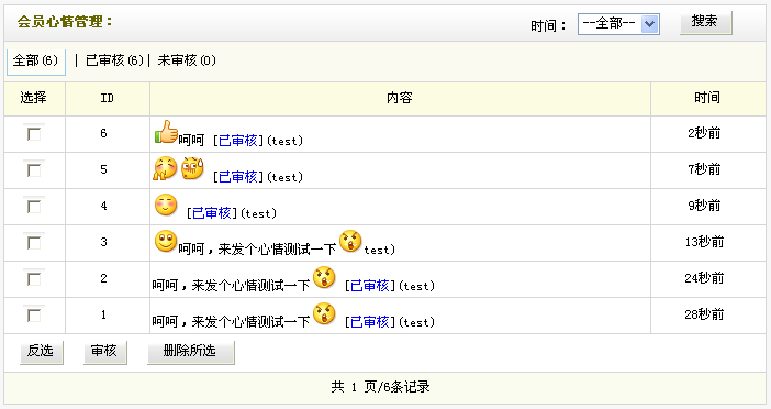 您可以勾選指定心情后,點擊“審核”進行通過;也可以點擊“刪除所選”來進行批量清理。