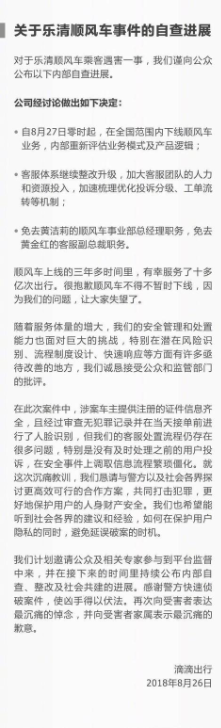 最新消息是,8月27日起,滴滴出行已經(jīng)開始在全國范圍內(nèi)下線順風(fēng)車業(yè)務(wù),重新評估業(yè)務(wù)模式和產(chǎn)品邏輯,并免去黃潔莉順風(fēng)車事業(yè)部總經(jīng)理職務(wù),免去黃金紅客服副總裁職務(wù)。