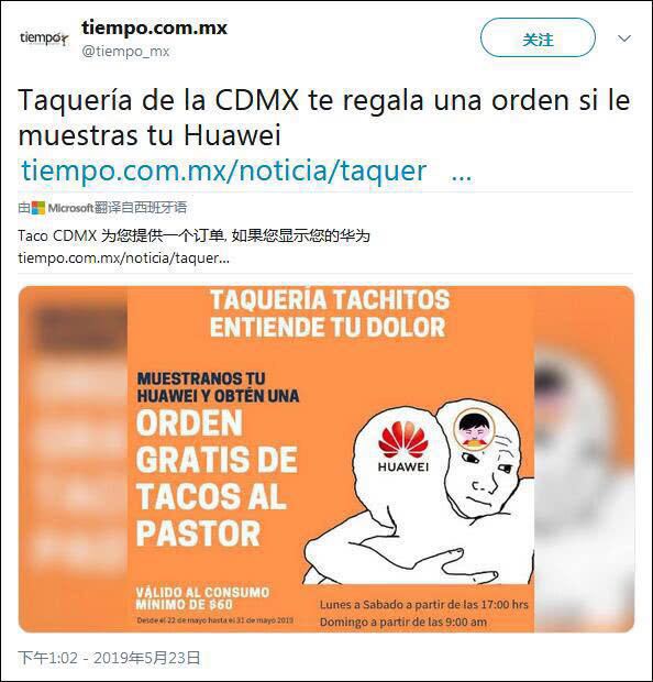 墨西哥一加餐廳日前貼出一張告示稱,只要是攜帶華為設(shè)備的食客,只要消費60比索,就能免費贈送一個玉米卷。海報還配了一張擁抱的圖片,表示理解華為,支持華為。