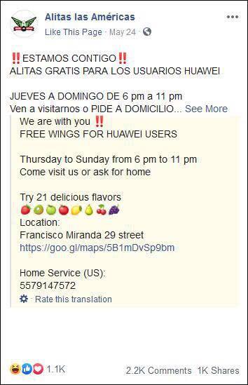表示支持的還有墨西哥的一家炸雞餐廳,這家餐廳社交媒體上表示,理解你的痛苦,免費贈送雞翅,只要使用華為設(shè)備,購買雙人套餐就可以免費獲贈雞翅。