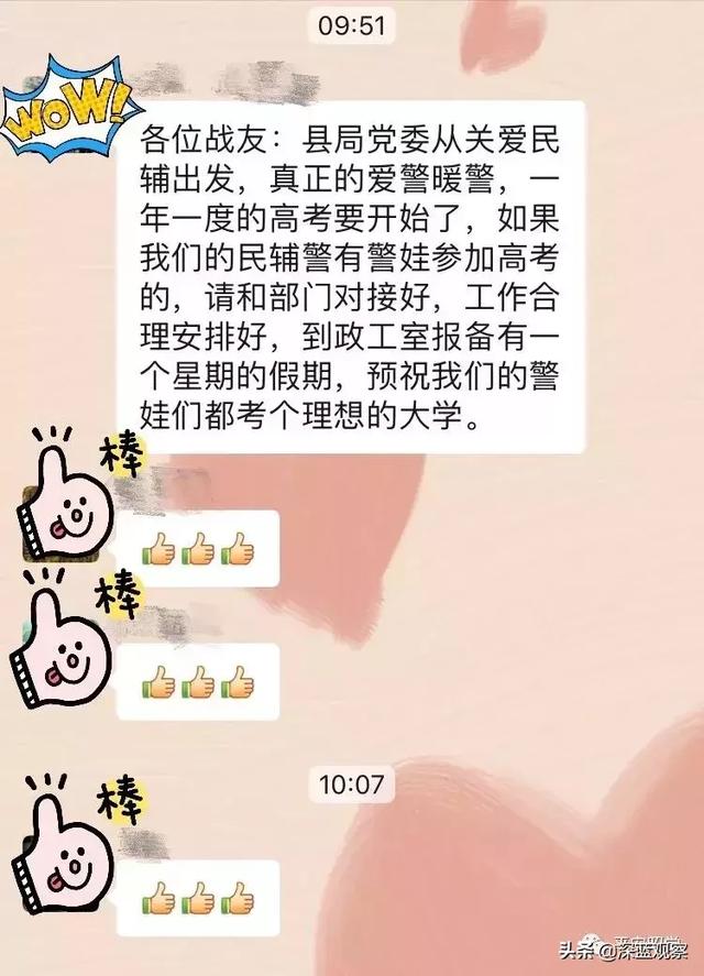 除了四川省昭覺縣公安局,蜀黍也看到內蒙古包頭市公安局安排了“陪考假”。通知稱,要求各級公安機關合理安排工作任務,及時安排調休,確保民警能夠陪伴孩子高考。這意味著,今年高考期間,包頭117名民警可放心陪娃考試。