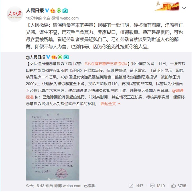 快遞員下跪求原諒 民警開證明各方反應(yīng)迅速抵制惡意投訴行為