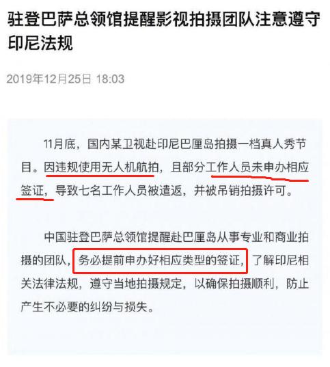 中國駐登巴薩總領館消息,11月底,國內某衛視來巴厘島拍攝一檔真人秀節目。因違規使用無人機航拍,且部分工作人員未申辦相應簽證,導致七名工作人員被遣返,并被吊銷拍攝許可。此事被印尼媒體報道,造成不良影響。