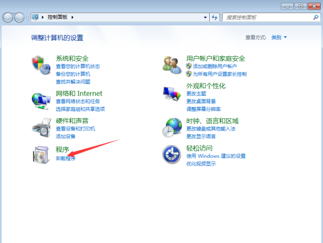 4、進入控制面板界面找到程序選項,點擊下方的卸載程序按鈕,進入到安裝程序列表界面。