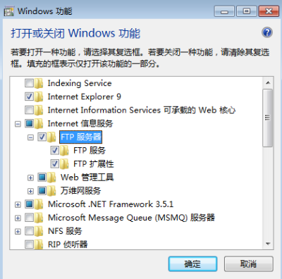 6、進入到打開或關閉Windows功能界面,我們找到Internet信息服務,然后點擊打開FTP服務器,也就是把其子菜單的FTP服務和FTP擴展性打勾,然后點擊下方的確定按鈕。