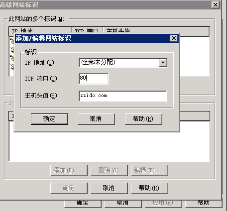 第三步,進(jìn)入“高級網(wǎng)站標(biāo)識”屬性面板后,保持“ip地址”、“TCP端口”、“主機(jī)頭值”下原有的默認(rèn)值不變,點(diǎn)擊選擇“添加”按鈕,出現(xiàn)“添加\編輯網(wǎng)站標(biāo)識”的對話框,保持“IP地址”默認(rèn)值不變,將“TCP端口”設(shè)置成“80”,“主機(jī)頭值”是你要綁定的域名,可輸入你要綁定的網(wǎng)址,設(shè)置完成后點(diǎn)擊“確定”按鈕保存即可,如下圖: