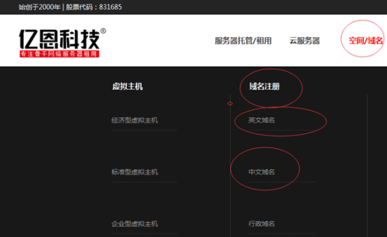 二、通過億恩科技首頁,找到空間/域名導航欄目,鼠標放上后下面會顯示域名注冊、英文域名、中文域名等信息,點開域名注冊按紐進入注冊域名詳情頁。