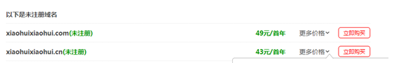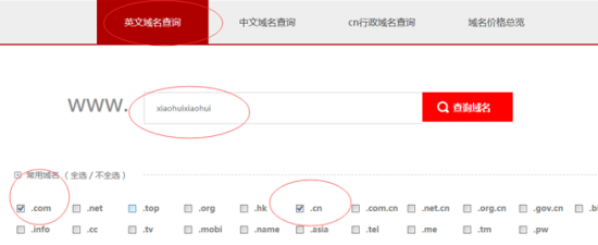注意查詢的時候不用輸WWW,空格里邊輸入所要注冊的域名,比如說你要注冊的域名是www.xiaohuixiaohui.com或www.xiaohuixiaohui.cn如上圖所示,空格處輸入xiaohuixiaohui在下面選擇COM或CN的后綴,(比較常用的是.com和.cn)然后點擊查詢域名即可。