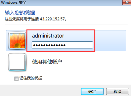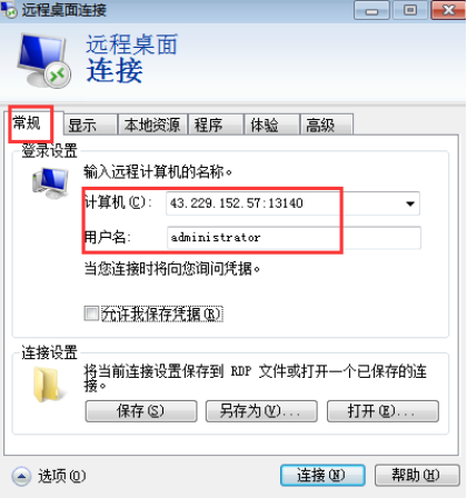 2. 輸入計算機(jī)IP和端口,用戶名。注意:IP和端口之間的冒號是必須要在英文狀態(tài)下輸入的,否則就登錄不上云服務(wù)器。用戶名一般用默認(rèn)的管理員的身份:administrator ,如果需要創(chuàng)建新的用戶名,進(jìn)入服務(wù)器后可以直接添加。建議大家在開通云服務(wù)器之后,要及時修改登錄密碼。