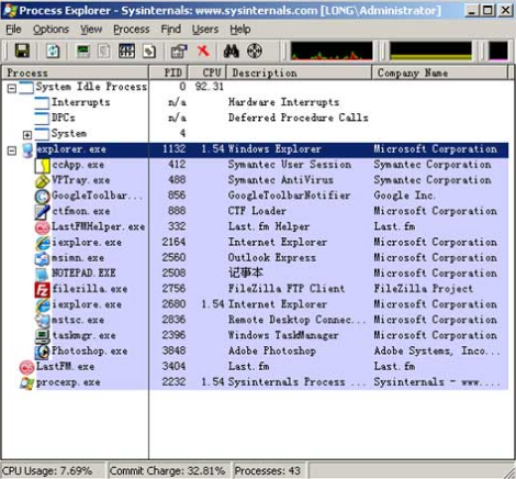 Process Explorer - Process Explorer是一款免費的進程監視工具,功能比Windows自帶的任務管理器要強大的多,不僅可以監視、暫停、終止進程,還可以查看進程調用的DLL文件,是預防病毒、查殺木馬的好幫手。