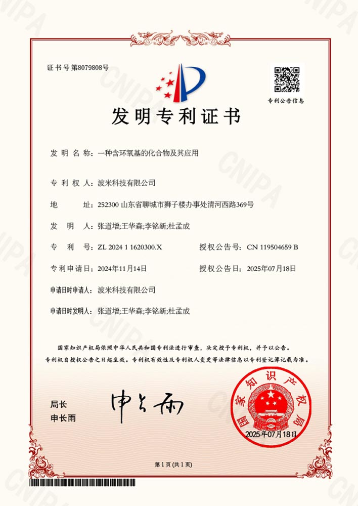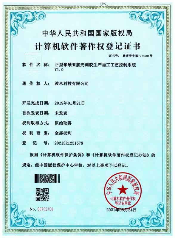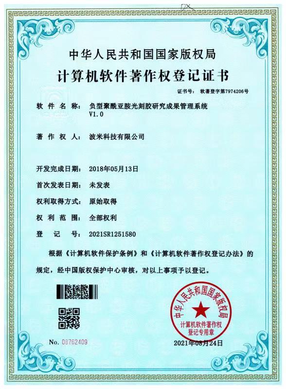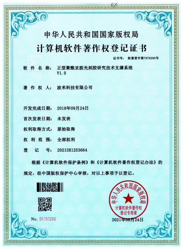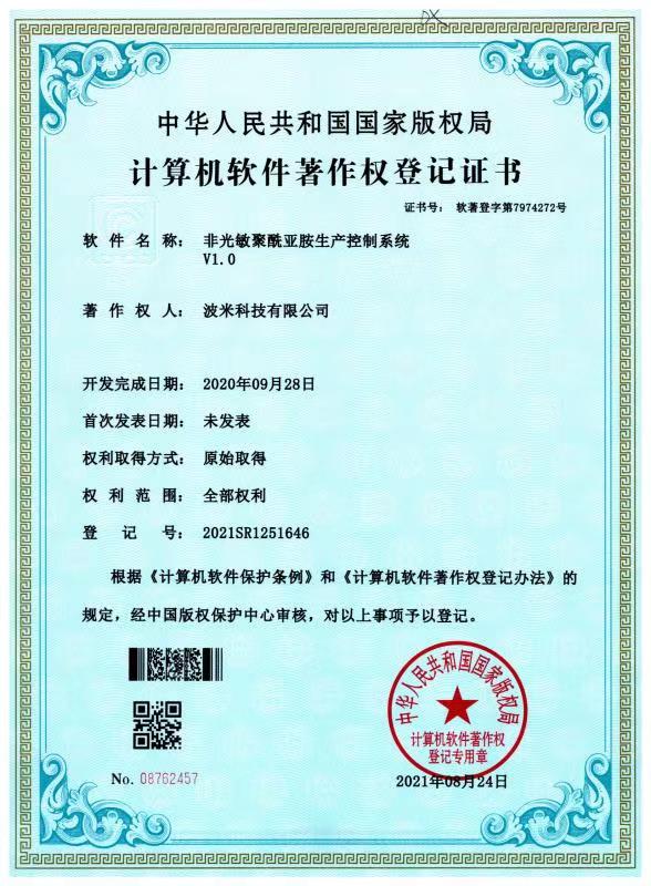 波米依托山東省院士工作站、山東省顯示與集成電路用聚酰亞胺涂層膠重點實驗室(籌)等研發平臺,承擔了國家級關鍵技術攻關項目1項、山東省重點研發計劃(重大科技創新工程)4項、省市縣級重點研發項目10余項。公司已累計申報核心專利75項(其中52項發明專利已獲授權,23項發明專利處于實質審查階段)。